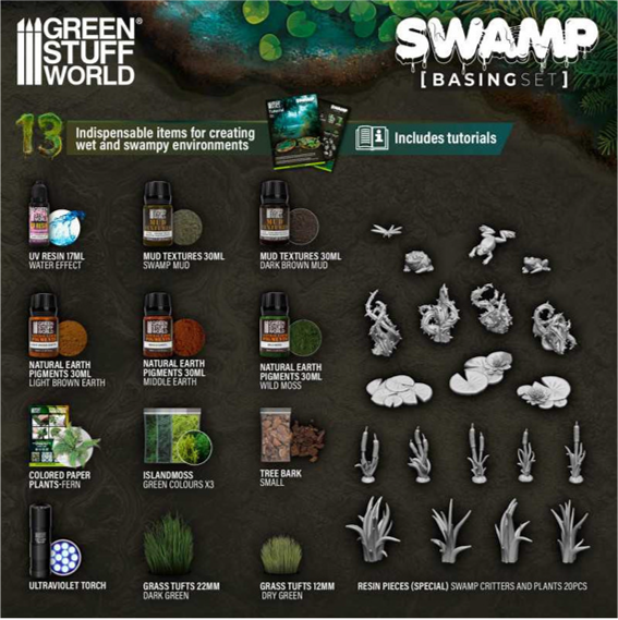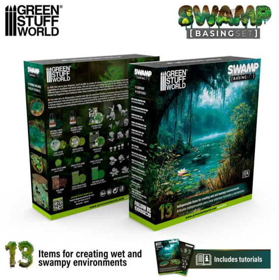 湿地帯に存在する干潟や湿原、沼沢のジオラマを作成するために必要なさまざまなマテリアル13種類を集めたベーシング(土台製作)セットです。紫外線を当てて硬化させて水の表現を行なうUVレジンによる水の効果を中心に、泥やコケなどのテクスチャーを加え、塗料、草木、レジン製の草や水棲生物なども含まれているので、このセットを使用するだけで思い通りのジオラマベースを簡単に作り上げることが可能です。