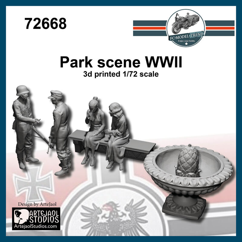 第二次大戦の庭園でタバコを吸いながら休息する兵士や女性の姿を再現するフィギュアセットです。映画「ヒトラー 最期の12日間」の1シーンを彷彿とさせるジオラマをすぐに製作することが可能です。