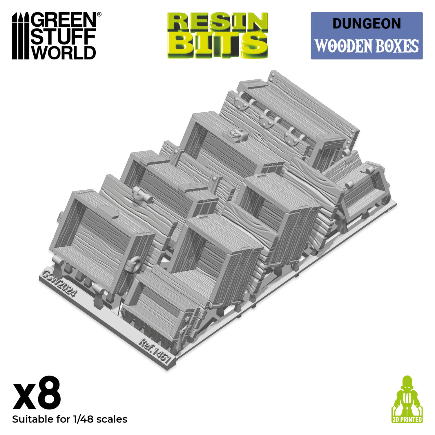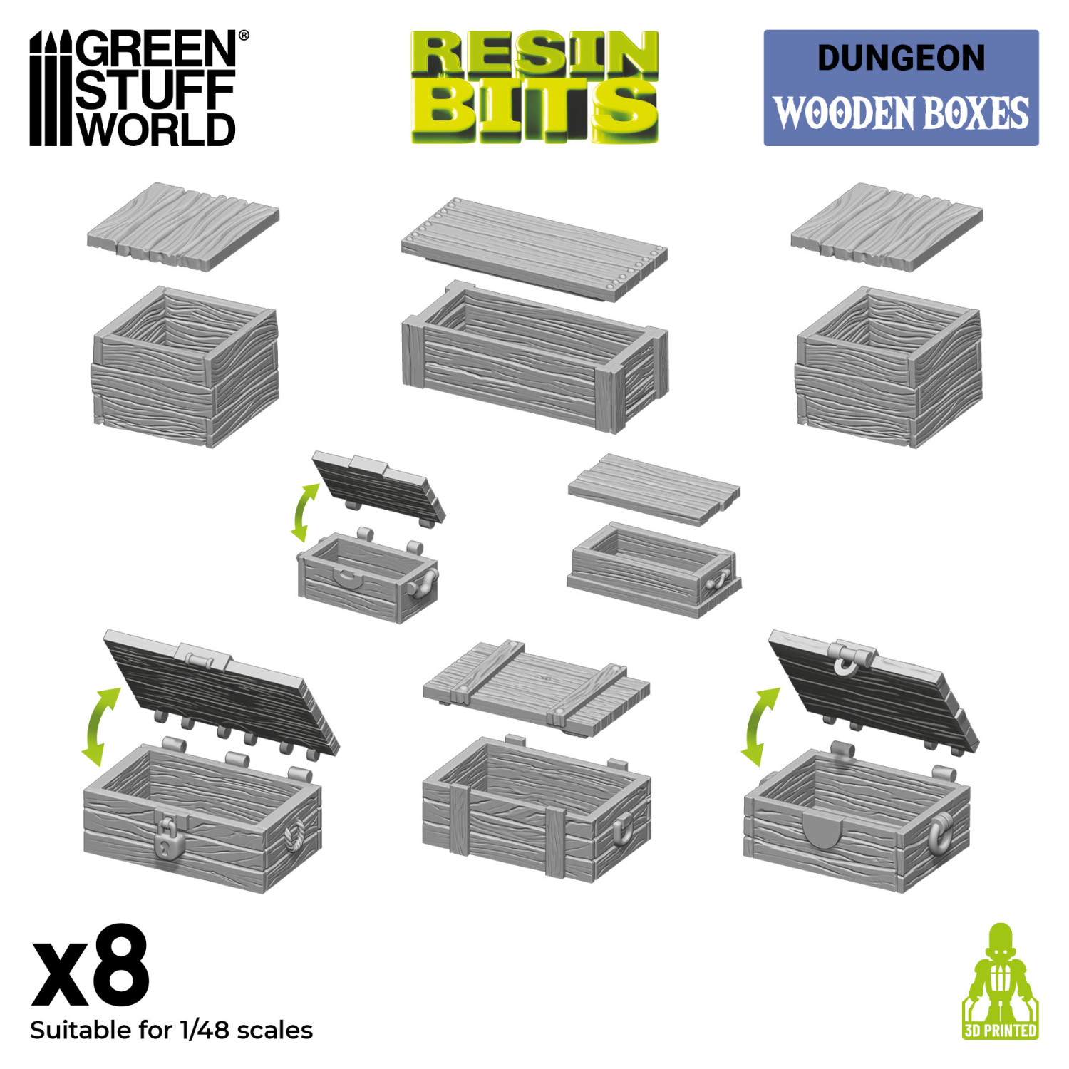 Green Stuff World の木箱(Wooden Boxes)セットは、高品質レジン製の3Dプリントパーツとして、ジオラマやミニチュアベースの装飾に最適なアクセサリーです。細部までリアルに再現された木箱で、ゲームボードやフィギュアの世界観をさらに引き立てます。