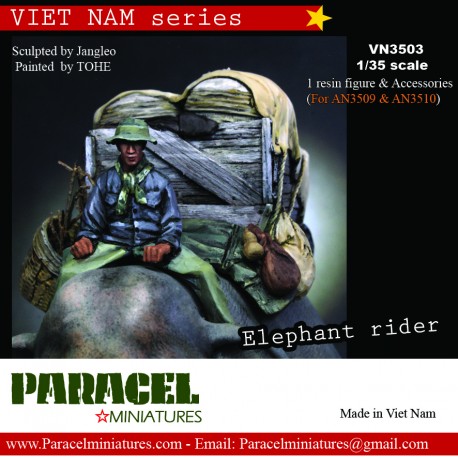 ゾウを調教し切り出した木材の移動や荷物の運搬、密林での移動などの労役に付く人を象使いと呼びます。タイ、カンボジア、ラオス、インドなどでは現在でも職業として活動してます。地域によってはゾウに乗る事を観光事業としています。これらを行う象使いとゾウの背に載せる荷物をセットにした製品です。キットはベトナム戦争で物資搬送の任務に付いた兵士姿の象使いですが塗装次第で現在の象使いにしてもなんら問題有りません。