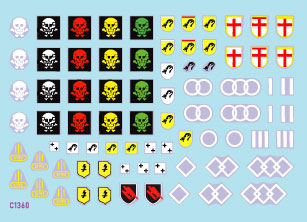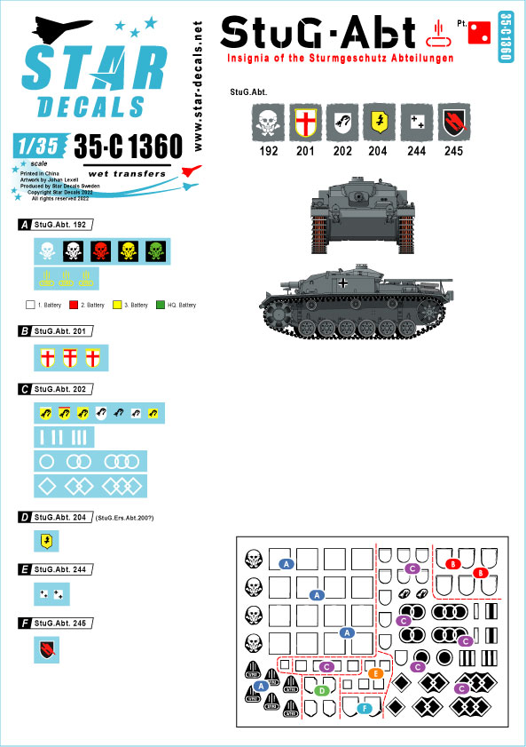 ドイツ軍の突撃砲大隊に所属するIII号突撃砲などの車輌に記入された部隊章を集めました。収録部隊は第192、第201、第202、第204、第244、第255突撃砲大隊の6種類で、異なるカラーの砲兵中隊マークも各大隊毎に用意しています。
