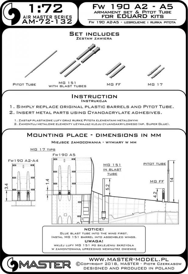 MASTER[AM-72-132]Fw 190 A2 - A5 armament set (MG 17, MG FF, MG 151 barrel tips) & Pitot Tube (for Eduard kit)