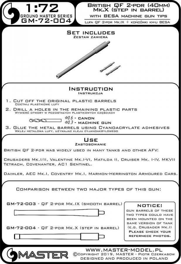 MASTER[GM-72-004]British QF 2-pdr (40mm) - version Mk.X (step in barrel) + Besa MG tips - for Crusader Mk.I/II, Valentine, Matilda II, and other AFV