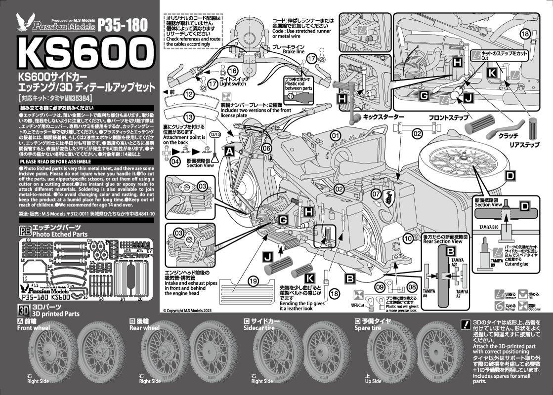 ナンバープレートやエンブレムなどはエッチングによる精密さで表現しつつ、スポークを再現したタイヤ、各種レバー類、ホーン、ステップなどは3Dプリントパーツとして同梱しています。