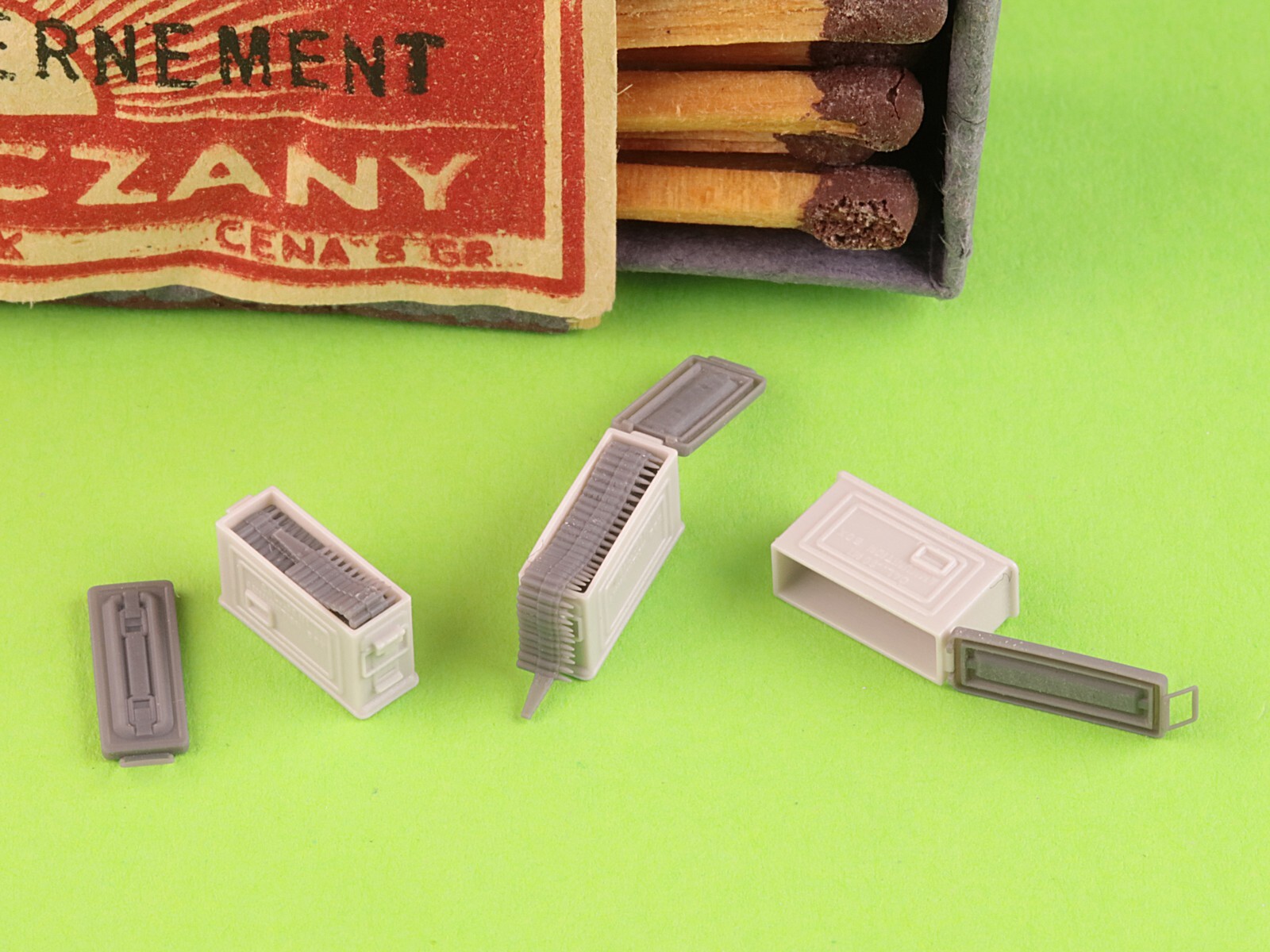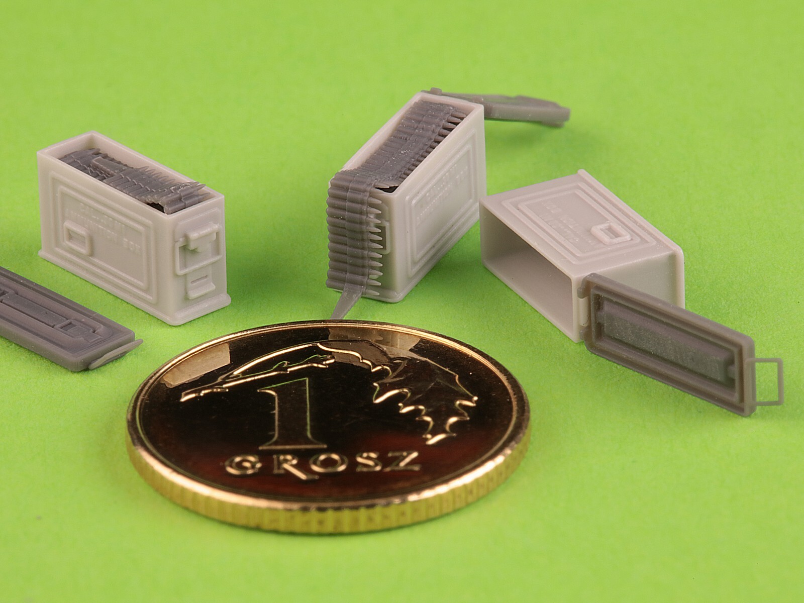 フタが開いた状態の弾薬箱をモデル化しています。内部にセットする弾帯パーツ2個、側面に貼り付けるマーキングのデカール、弾薬箱をサポート材から安全に切り取ることができる治具も用意しています。