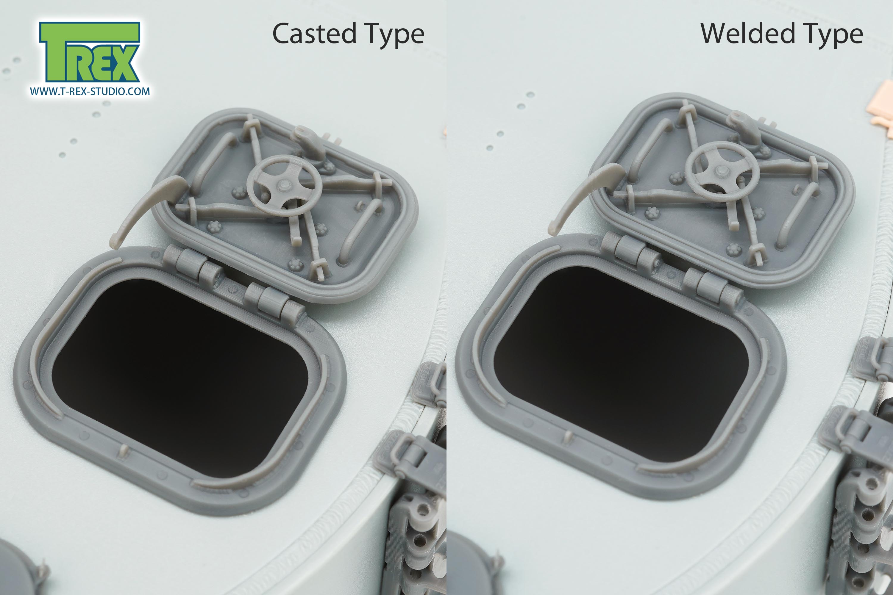 極初期型から初期型に装着された装填手ハッチを、ハッチ周囲のブラケットも含めて再現します。溶接タイプ1個と鋳造(あるいはプレス)タイプ1個、計2個をセットします。表面はもちろん、内側のロック機構や取っ手なども精密に再現します。