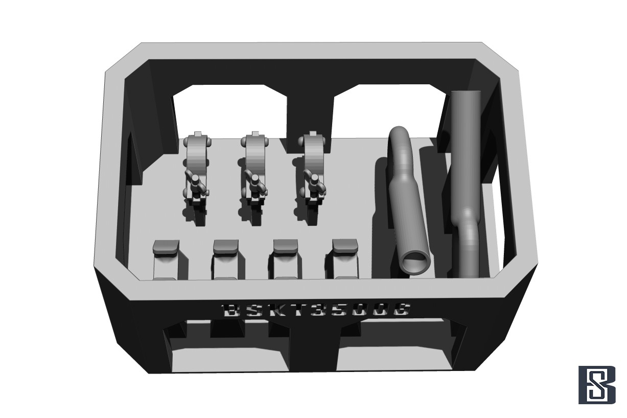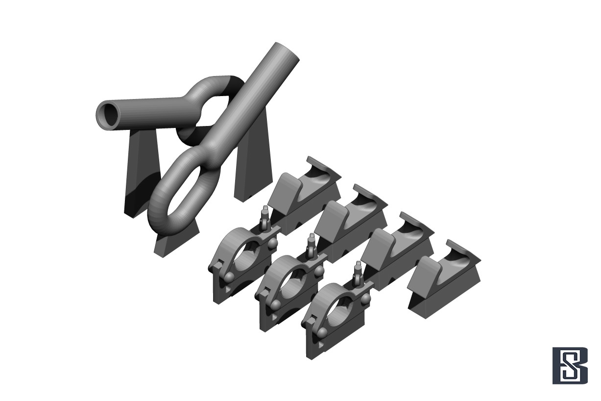 3Dプリント製パーツと金属ワイヤーのセットです。車体に固定するホルダー4個とクランプ3個も用意しています。