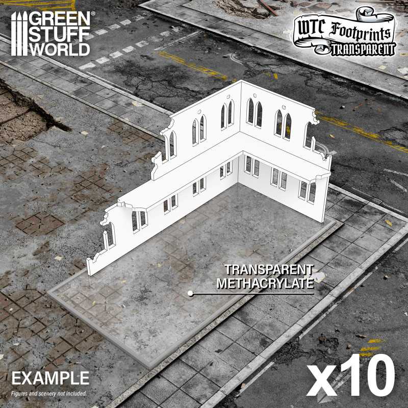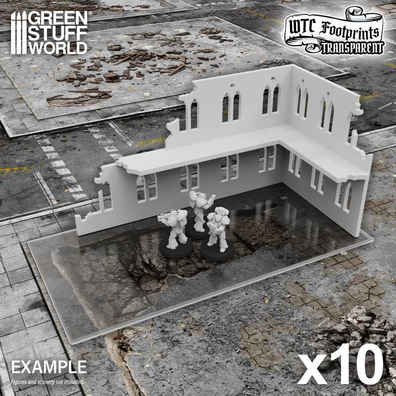 Green Stuff World's glasspack footprints are transparent 1 mm bases that precisely mark the footprint of buildings and ruins for games compatible with Warhammer 40,000? and WTC events. Made from fully transparent, flexible, and unbreakable glasspack plastic, they preserve your gaming mat’s aesthetics and won’t create edges that trip up your models.