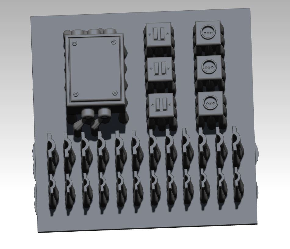 家屋や工場などに設置されている配電盤、スイッチ、コンセント、ケーブル押さえなどの電気関係の部品を再現する3Dプリント製アクセサリーパーツセットです。配電盤1個、スイッチ3個、コンセント3個、ケーブル押さえ大小各12個ずつ、計31個をセットしました。