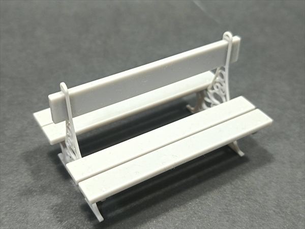 ヨーロッパの公園などに見られる、背中合わせのベンチを再現する3Dプリント製アクセサリーパーツです。背板と座板は木製の表面を再現、台座部分はクラシカルな装飾が施されています。
