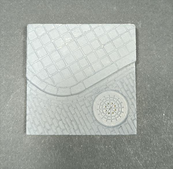 石畳で舗装された道路と歩道を再現するレジン製ビネットベースです。曲がり角で道路と歩道の境界が曲線となっており、中央にはマンホールも再現されています。サイズは60mm×60mmです。