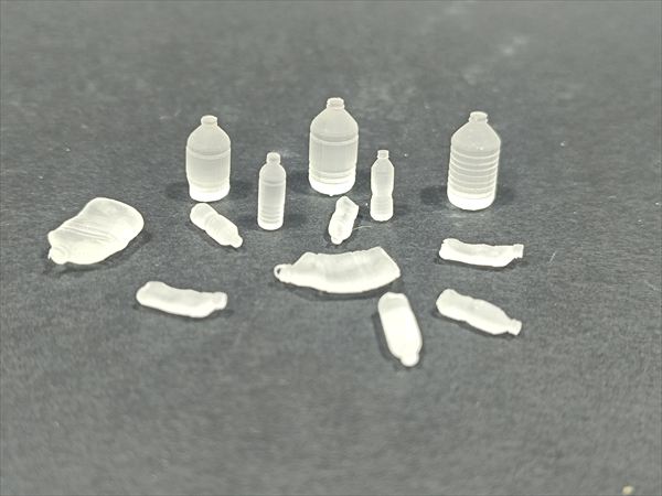 500ml以上のPETボトルなどの比較的大型の透明なビン(ボトル)を再現する3Dプリント製アクセサリーパーツセットです。さまざまな形状や状態のビンを合計15個セットします。