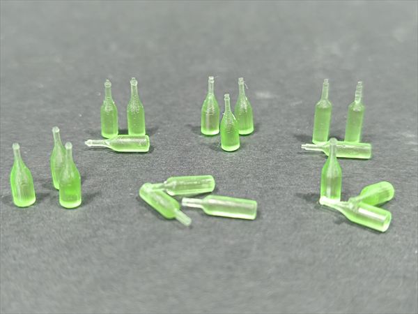 ワインやビールなどに使用される緑色に着色された透明なガラスのビン(ボトル)を再現する3Dプリント製アクセサリーパーツセットです。6種類のビンを各3個ずつ、合計18個セットします。