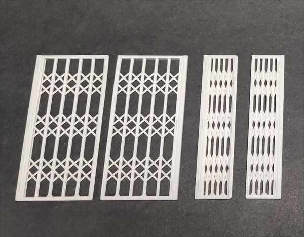 旧式のエレベーターのドアなどに見られる折り畳み式の鉄格子を再現する3Dプリント製アクセサリーパーツセットです。広げた状態を2個、畳んだ状態を2個、計4個をセットします。