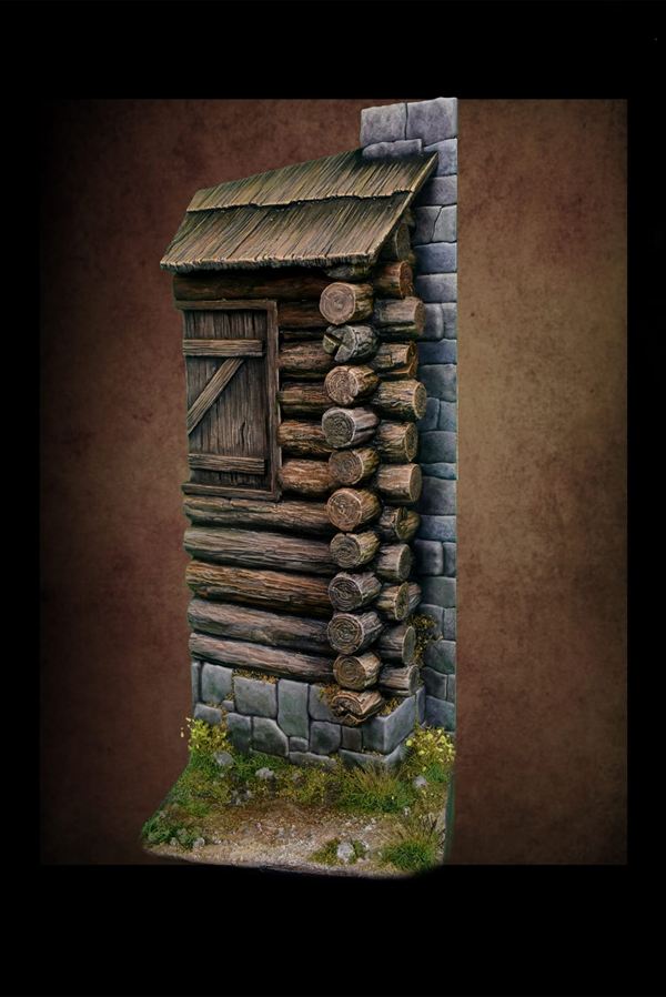 丸太で作られたログハウスの外構の一角を再現する3Dプリント製フィギュア用ベースです。ベースサイズは50mm×50mm、高さは120mmです。