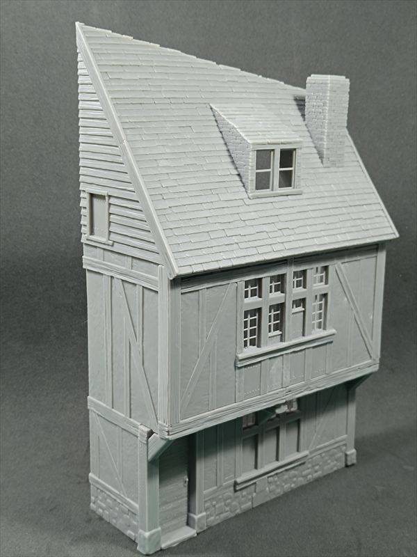 北フランスやドイツでよく見られる「ハーフティンバー構造」と呼ばれる梁や柱が露出した家を再現する3Dプリント製ジオラマベースです。3階建ての建物で、屋根裏部屋の窓や煙突も再現されています。サイズは19cm×10cm、高さは31.5cmです。