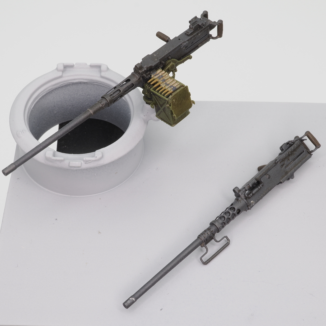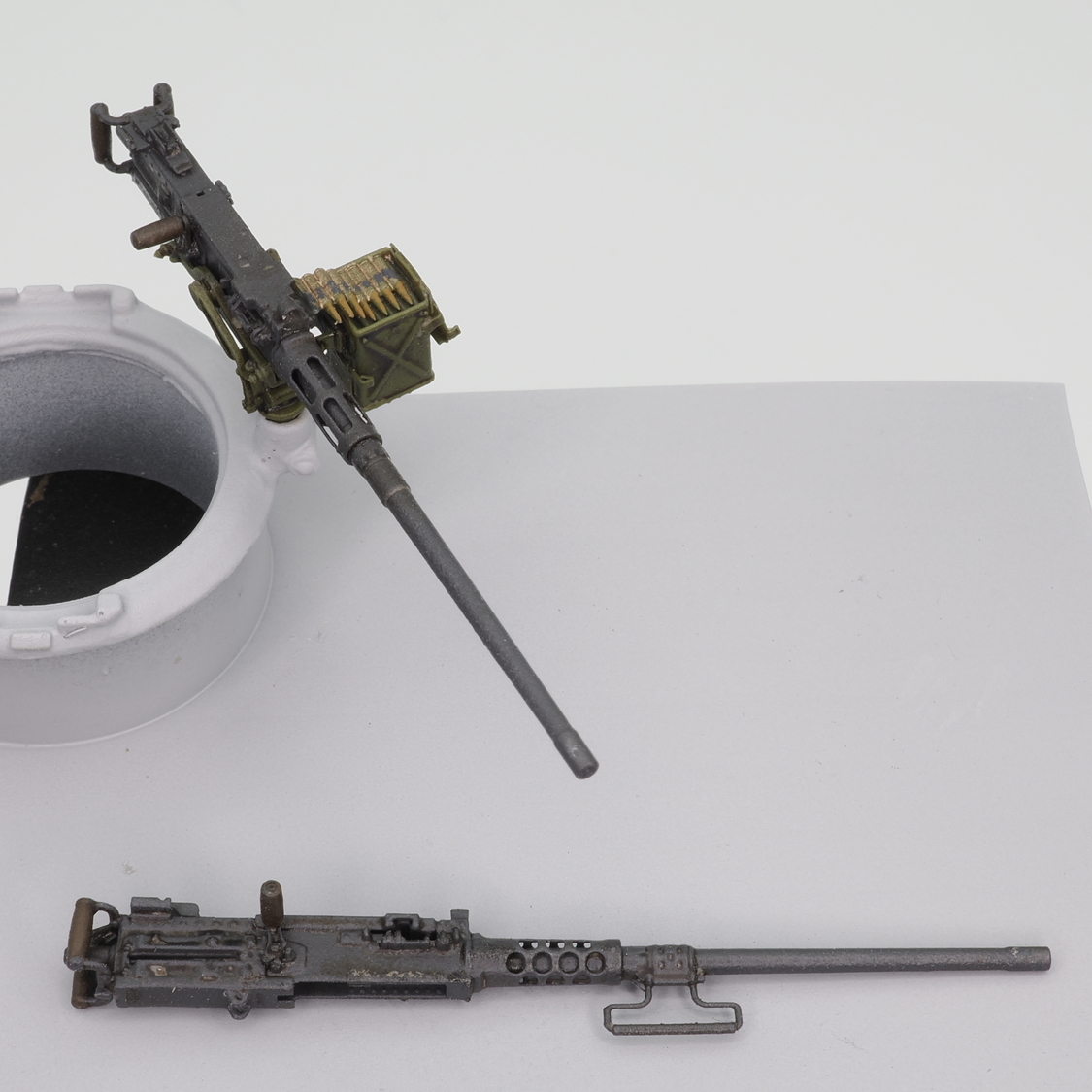 第二次大戦のアメリカ軍で多数が運用された.50cal(12.7mm)M2重機関銃を再現するディテールパーツです。初期型ピントルマウントに搭載された状態をモデル化します。銃身は放熱筒の形状などが異なる初期型と後期型の2種類の選択式、初期型弾薬箱と弾帯も付属します。