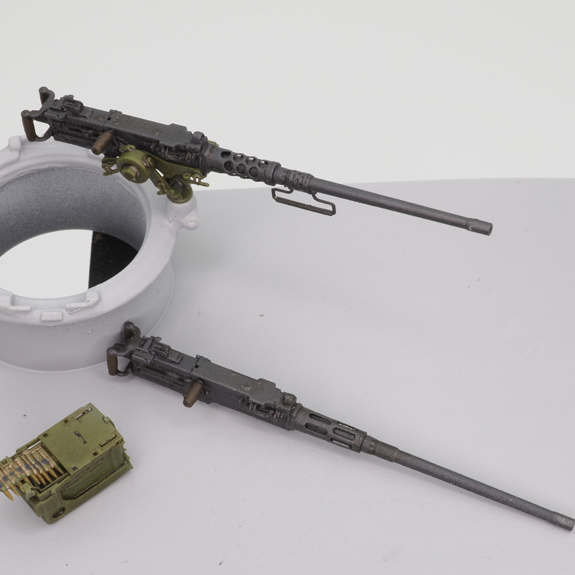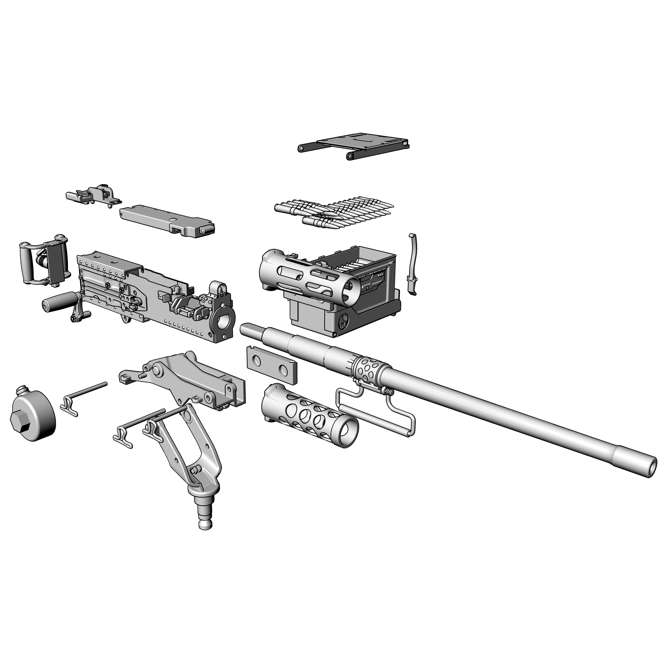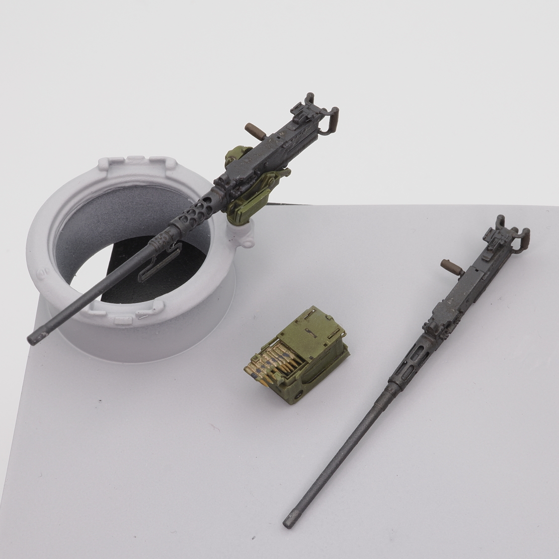 第二次大戦のアメリカ軍で多数が運用された.50cal(12.7mm)M2重機関銃を再現するディテールパーツです。後期型ピントルマウントに搭載された状態をモデル化します。銃身は放熱筒の形状などが異なる初期型と後期型の2種類の選択式、後期型弾薬箱と弾帯も付属します。