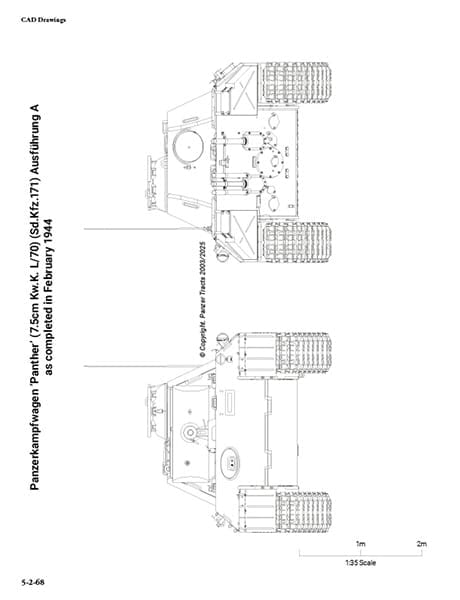 総ページ数は約2倍の128ページ、108点の高解像度大判写真(うち71点は新規)を掲載します。50ページに及ぶ詳細な1/35・1/20・1/10スケールCAD図面は、パンター製造メーカー3社が採用した工場公差と組み立て基準に厳密に準拠し、現時点で最も精度の高いパンターA型の図面となります。