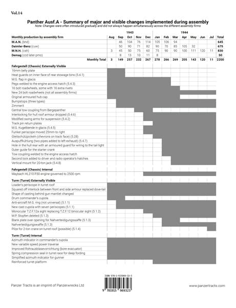 解説は最新の考証を反映して書き直され、D型に類似した初期生産車から1944年7月に製造された最終生産車に至るまで、パンター戦車A型の開発史を包括的に検証し、技術的変更点、設計の改良点、運用期間中の改修を時系列で網羅、図表、注釈、新たに解明された工場記録も例示します。また裏表紙には主要変更点をまとめたクイックリファレンス表を掲載しました。他のPANZER TRACTSシリーズと同様、戦時中の原資料、工場記録、現存車両の綿密な検証のみに基づいて構成され、推測は一切なく、厳密に解釈された確固たる事実のみを提示しています。