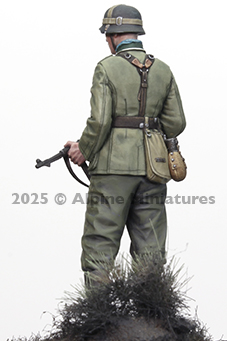 M36野戦服を着用、ジャックブーツを履き、両手でMP40機関短銃を持って立つ国防軍下士官(NCO)の姿をモデル化しました。マガジンポーチ、雑嚢、水筒などの装備品も精密に再現します。ヘルメットを被ったヘッドは2個入で、偽装止めベルト付/迷彩カバー付の選択式です。