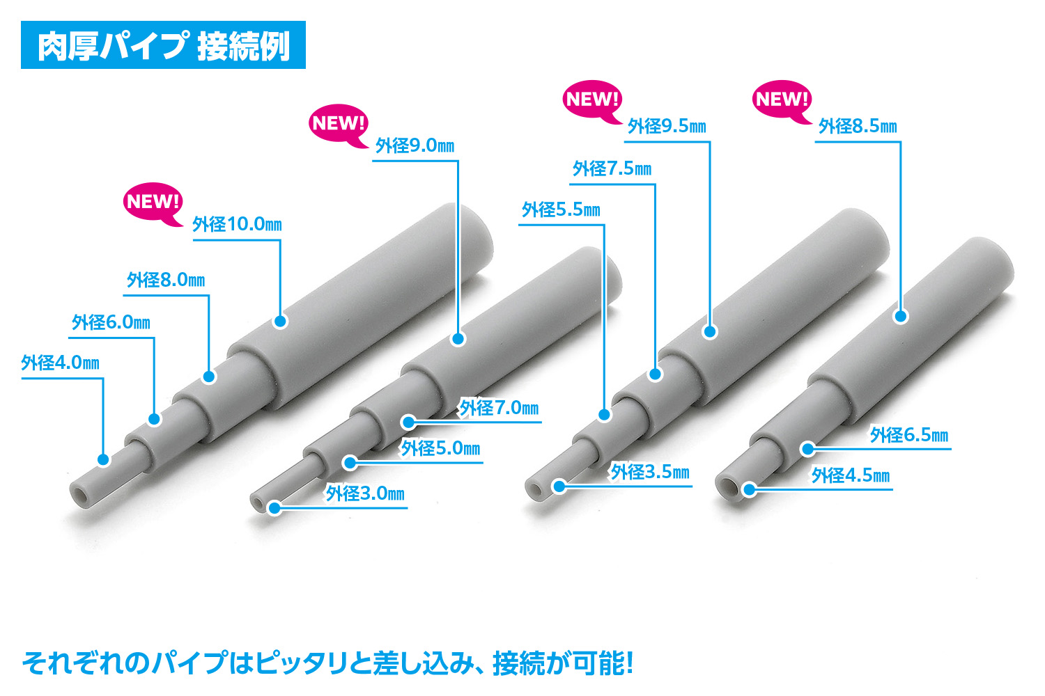 パイプ外径は使いやすいピッタリサイズ(3.0/3.5/4.0/4.5/5.0/5.5/6.0/6.5/7.0/7.5/8.0mm/8.5mm/9.0mm/9.5mm/10.0mm) としました。