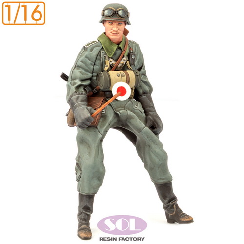 オートバイコートを着用し、右手に交通標識を持ち、左足を地面に付けて停車中の野戦憲兵をモデル化しています。背中のMP41機関短銃などの装備品も精密に再現します。