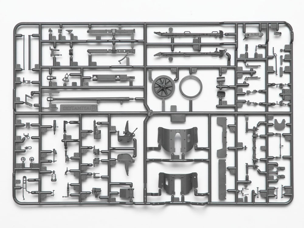 湾曲した装甲板を2枚重ねた防盾やタイヤの溝、シャベルが付いた下部装甲板もリアルにパーツ化。
