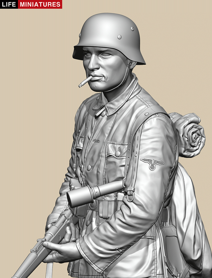 1/10スケール、腰から上のバストサイズ(胸像)で3Dモデル化し、両手でKar98k小銃を持ち、左脇に柄付き手榴弾をはさみ、タバコをくわえて前方を伺う姿を再現しています。迷彩カバーのないヘルメット、M43野戦服、背中に背負ったポンチョ類やサスペンダー、腰の弾薬盒、雑嚢、水筒、スコップなどの装備品もハイディテールな仕上がりで、ラージスケールフィギュアならではのペインティングが楽しめます。パーツ数は18個です。