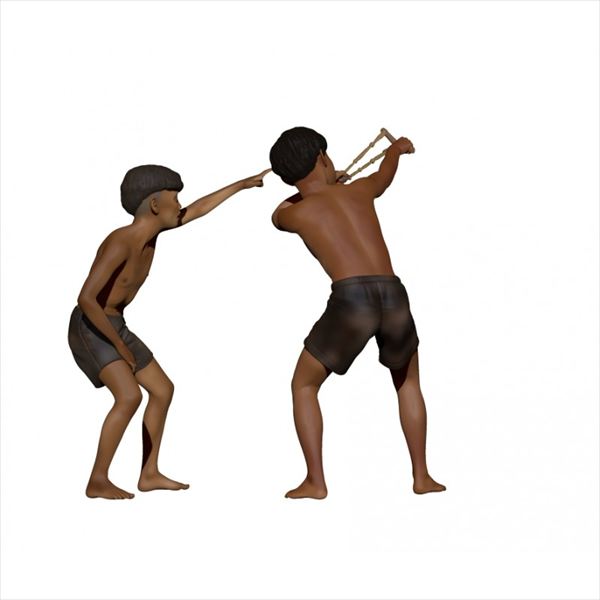 Y字形の簡易なスリングショット(パチンコ)を使うベトナムの少年たちを再現するフィギュアセットです。スリングショットで狙いを付ける少年と、目標を左手で指示する少年の計2体をセットします。
