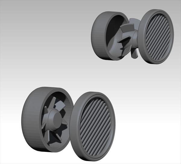 建物の内外に見られるファンを内蔵した丸形の換気口を再現する3Dプリント製アクセサリーパーツです。大小2種類を1個ずつ、計2個をセットしました。外側の細いスリットや内部の7枚羽根のファンも精密に再現しています。
