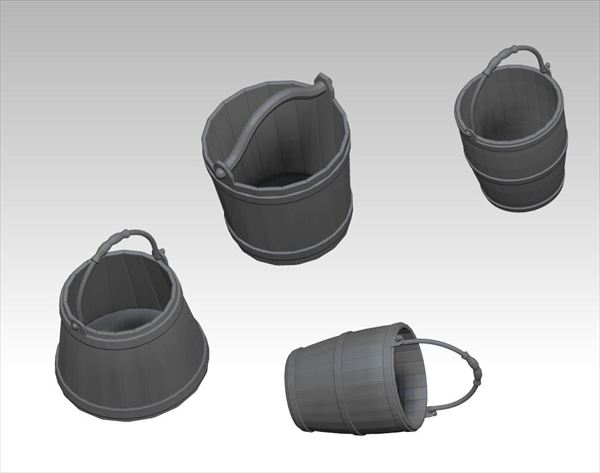 樽型の木製バケツを再現する3Dプリント製アクセサリーパーツです。さまざまな形状の4種類のバケツを各1個ずつ、計4個をセットします。