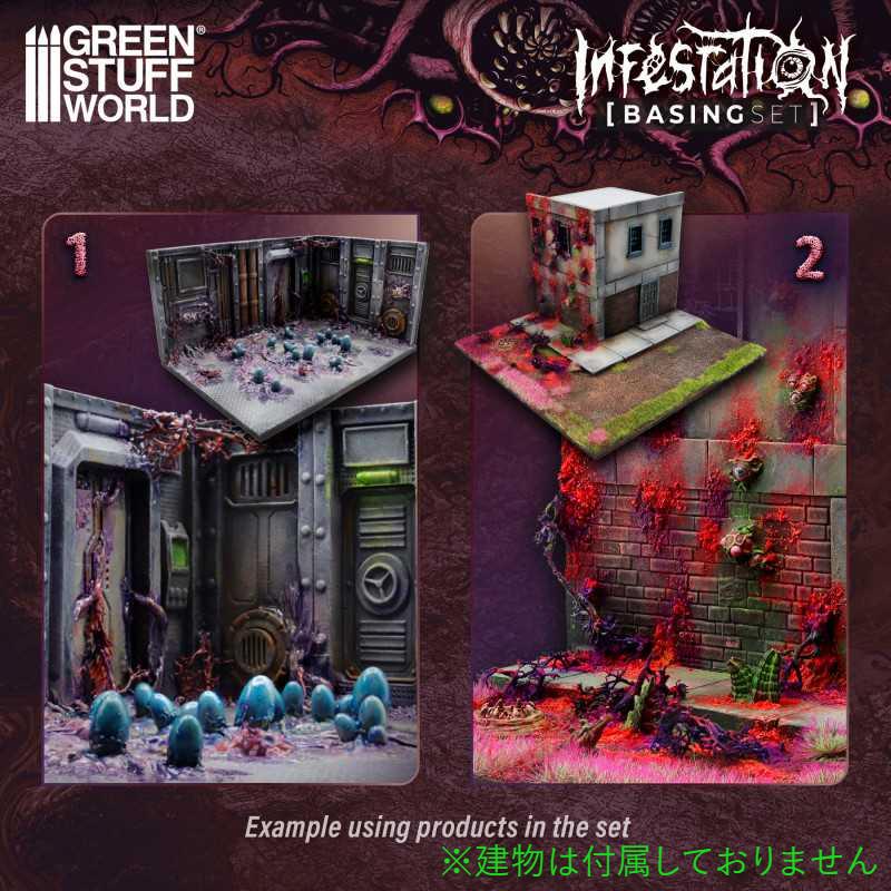 インフェステーション ベーシングセットは、エイリアン生物や蛍光植物、異形の構造物などを使い、異世界の侵食された地形を作るためのセットです。初心者でも扱いやすく、ホビーやウォーゲーム用のモデルに最適です。