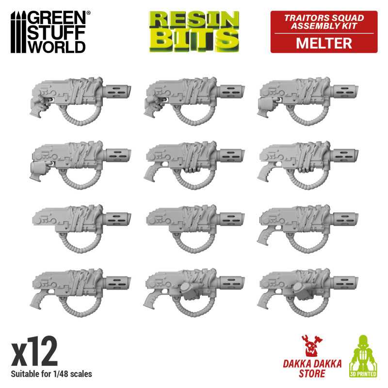This set includes 12 melter (4 no-handed, 4 right-handed, 4 left-handed), and will allow you to assemble your own compatible Space Marines? by assembling the rest of the pieces from the DakkaDakka Store designs, as well as to convert and customize your own compatible Space Marines?. These resin bitz are 3D printed ABS-like for flexibility and resistance to accidental breakage and are perfect for 1:48 scale miniatures, as well as compatible with your favorite wargames and board games.
