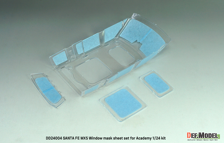 ヒュンダイが2023年に発売したSUV乗用車サンタフェMX5のウインドウ塗り分けを容易にするマスクシートとメタルステッカーのセットです。アカデミー製キットに対応します。