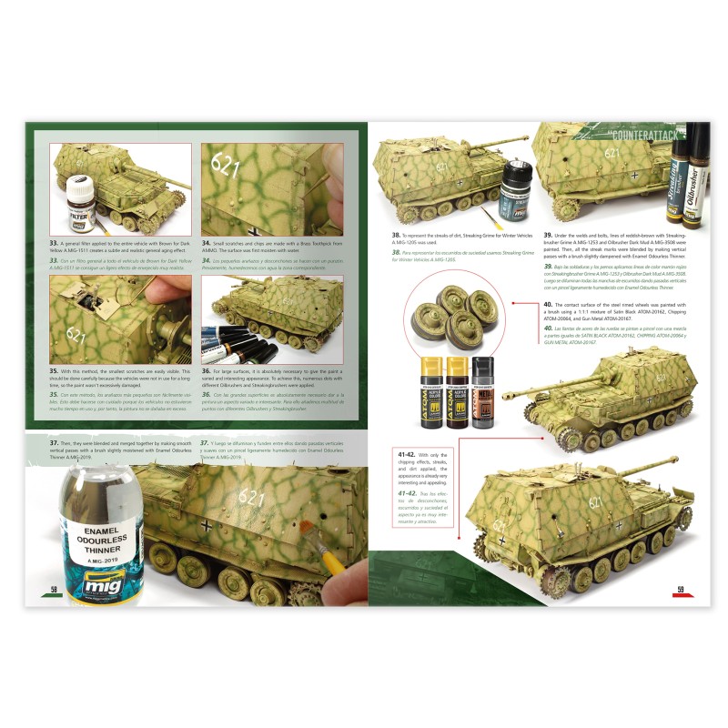 ヴェスペ自走砲、フェルディナント、タイガーI、III号戦車、III号突撃砲、T-34/76、SU-122、KV-1 など、戦場を彩る名車両を完全収録。建物や塹壕、橋、水場の作り方、フィギュアやアクセサリーの塗装例も詳しく紹介しています。