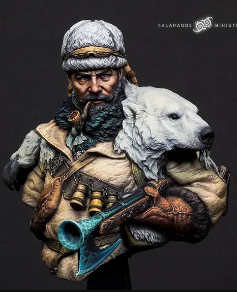 略奪に遭ったある村落の虐殺からただ一人生き残り、北国の厳しい環境に身を置き炎と氷のような意志で自らを鍛え、この世の堕落に対し正義を実行する者として戦う男「オイケウス」の姿をモデル化しています。毛皮の帽子と防寒ジャケットを着用し、背中にはカンジキを背負い、シロクマの頭とカギ爪を両肩に乗せ、パイプをくわえながら厳しい表情で前を見据える様子が生き生きと造形されています。組み立ても容易で、モデラーの自由な発想でファンタジーフィギュアのペインティングを楽しめます。