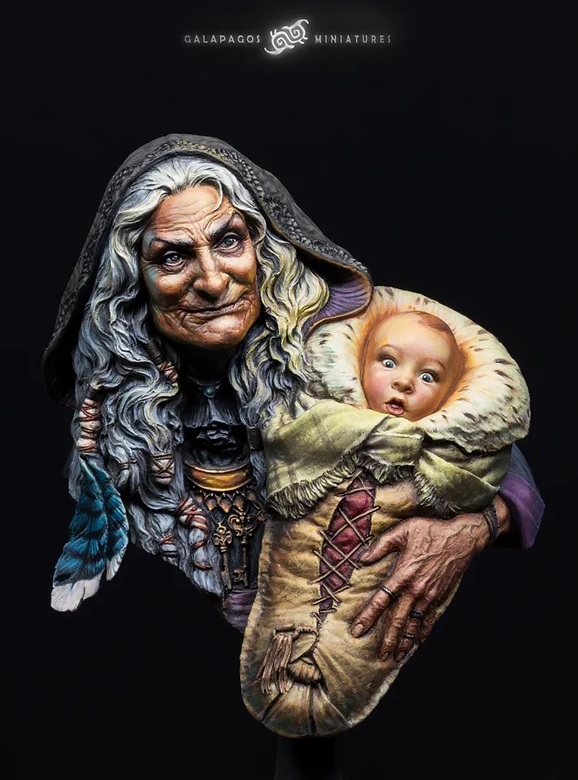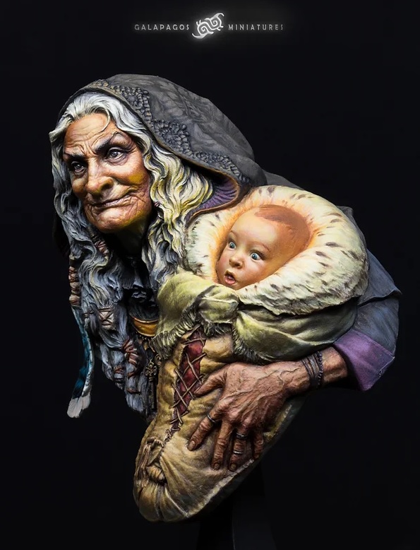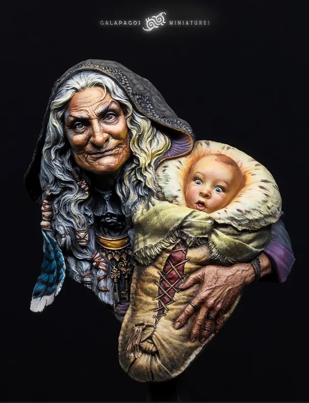 後に世界を照らすことになる「運命の子」としてアヴァロンの城に生まれた幼い弟の王子に、闇の種族からの危機が迫っていることを悟り、魔女の姿となって弟とともに居城を脱出する王女ミューアの姿をモデル化しています。ショールを被り決意を秘めた彫りの深い表情のミューアや、毛布に包まれて抱かれるあどけない幼子の王子などが生き生きと造形されています。組み立ても容易で、モデラーの自由な発想でファンタジーフィギュアのペインティングを楽しめます。