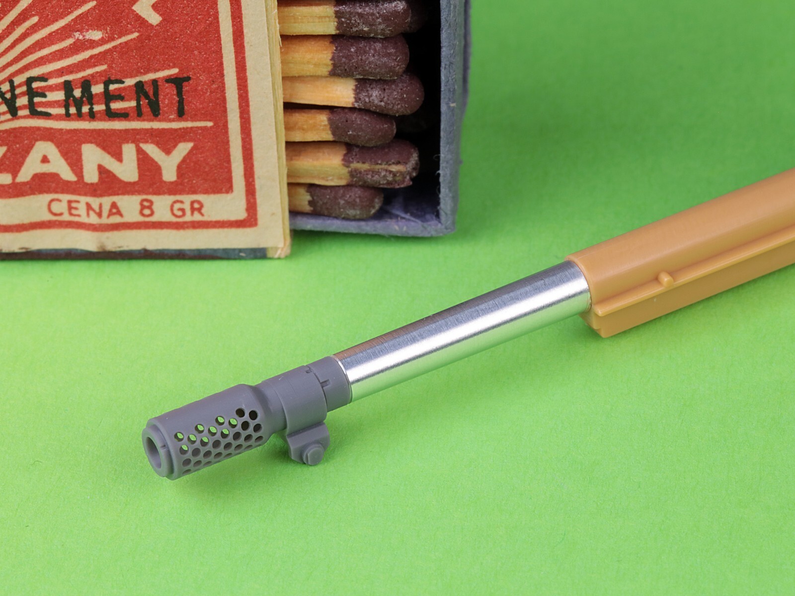 砲身はアルミ挽き物製、多孔式マズルブレーキは3Dプリント製です。