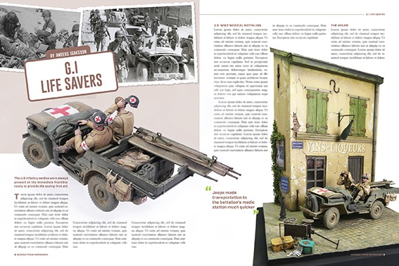 登場車両はIV号突撃砲、パンサー戦車G型、ウィリス・ジープ、シャーマン・ファイアフライ、トライアンフ3HW/BSA M20オートバイなど、国籍やジャンルは多岐に渡っています。記事の多くは多数のステップバイステップの写真を使い、車両だけでなくジオラマストラクチャーの製作の過程をていねいに解説します。また当時の戦場アーカイブ写真による実車解説も見逃せません。ジオラマに限らず模型製作の刺激やヒントを得られるお勧めの一冊となっています。