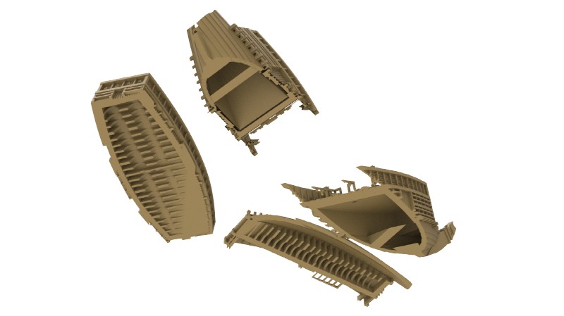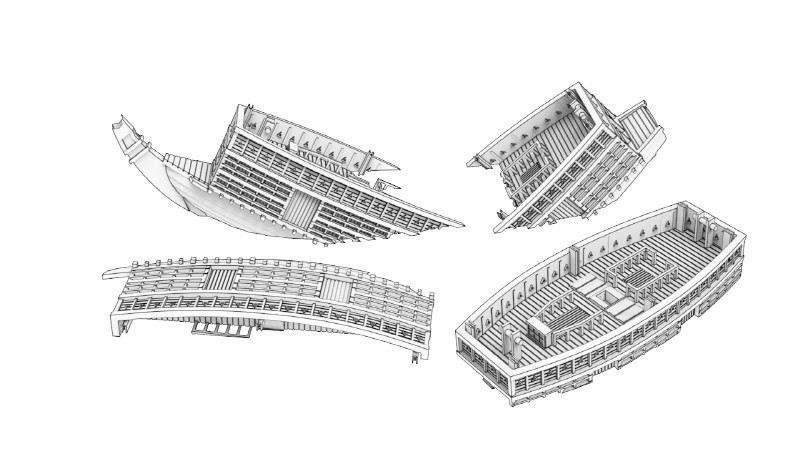 4バリエーション×2隻、計8個の撃沈された関船をモデル化しました。劇中の仕様をベースに、トリファクトリーのデザイン解釈による歴史的な軍艦モデルとして再現します。パーツは高精度の3Dプリント製で、オール、旗はエッチングパーツで再現します。