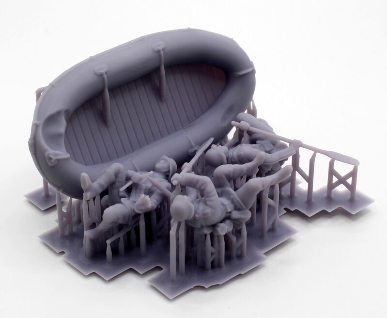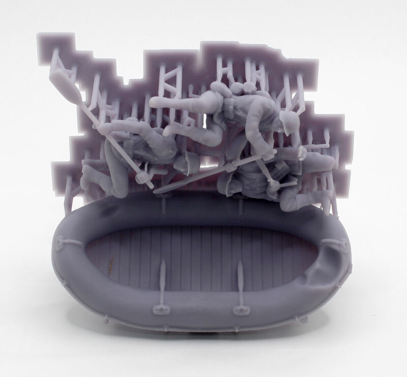 ゴムボートは水上で航行中の状態を再現、前後にオールを持った兵士が各1体、中央に機関短銃を持った下士官が1体、計3体のフィギュアをセットしました。