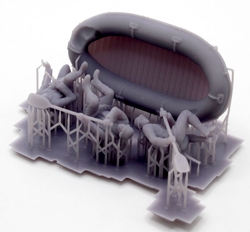 ゴムボートは水上で航行中の状態を再現、前後にオールを持った兵士が各1体、中央に機関短銃を持った下士官が1体、計3体のフィギュアをセットしました。