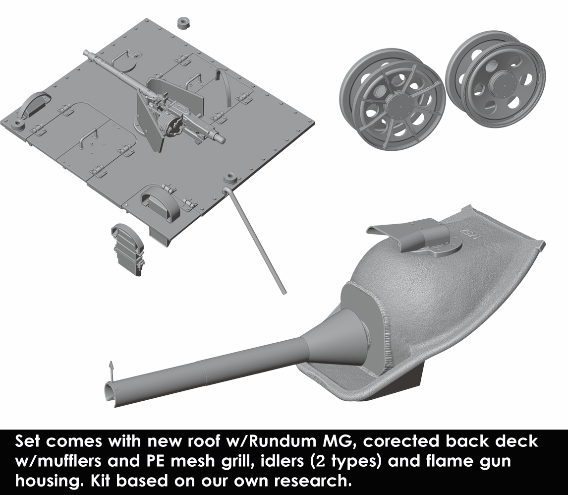 考証に基づき細部まで忠実に再現された火炎放射器とマウント、ペリスコープ付マントレット、戦闘室上面、MG34旋回式銃架をセットします。さらにエッチングパーツ製グリル付の機関室上面、2種類の誘導輪も付属しています。