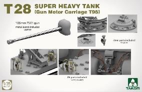 T28 重戦車(T95 戦車駆逐車)は第二次世界大戦中にアメリカで設計された旋回砲塔を持たない試作重戦車です。1943年に開発が決定され1944年にT28の呼称が与えられた本車は、ヨーロッパに構築された要塞線に配備されているドイツ軍の重/駆逐戦車群を撃破できる火力を備えていました。旋回式砲塔を装備せず密閉式の固定戦闘室を設けたT28は、1945年にT95戦車駆逐車へ改称されました。製造された2両のT28(T95)は1947年までアバディーン性能試験場およびフォート・ノックスで審査を受けました。本車の最大の特徴と言える、90t近い戦闘重量を支えるため接地圧の低減を図った内/外側の複列式の走行装置と履帯は、外側の走行装置をサイドスカートごと着脱し、鉄道輸送時や舗装路を走行する際は外側の走行装置を取り外して走行することが可能でした。また取り外した左右の外側走行装置は、サイドスカートが内側に来るように組み合わせて車体後方に牽引するよう設計されていました。アメリカ陸軍で唯一の突撃砲タイプの戦闘車両であるT28は、大戦の終結と本車の機動性の低さや超重量による運用上の制約、また1944年より開発が開始されたT29 重戦車の審査が優先された事により、1947年10月に開発計画は中止されました。試作された2両の内の1両は、フォート・ノックスのパットン戦車博物館に展示されています。