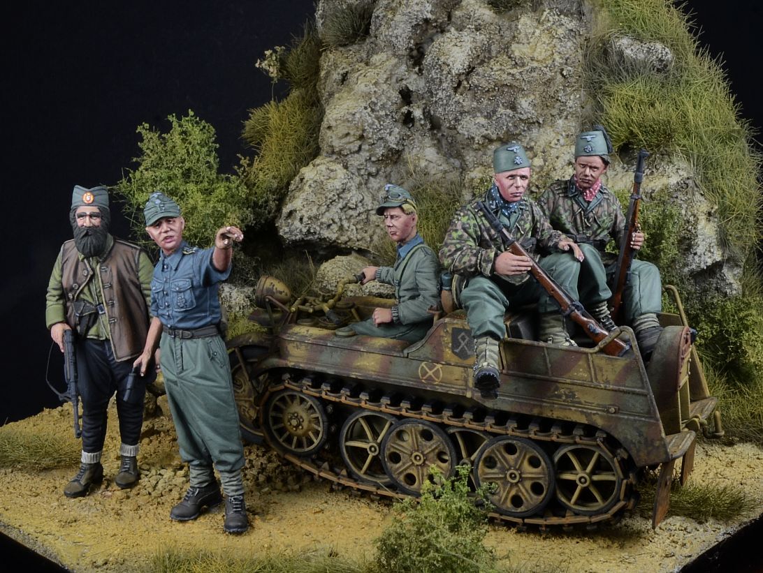 第二次大戦のドイツ占領下のユーゴスラビアにおける、ゲリラ組織「チェトニク」構成員1名、SS師団「プリンツ・オイゲン」の下士官1名と操縦手1名、SS師団「ハンジャール」兵士2名の、計5体を揃えた豪華なレジン製フィギュアセットです。タミヤ製キットに対応します。