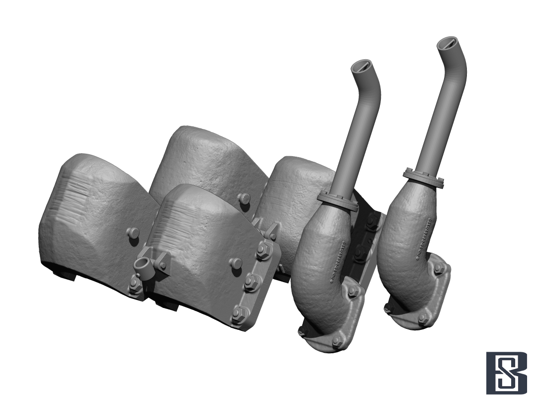 排気管は排気口の補強材、鋳造部分とパイプの接合部のボルト、車体接合部の形状、表面の鋳造肌などを精密かつ正確に再現します。基部の装甲カバーは、始動クランクブラケットの有無による左右2種類に加え、形状違い2種類の計4個をセット。車両の仕様に応じて選択可能です。