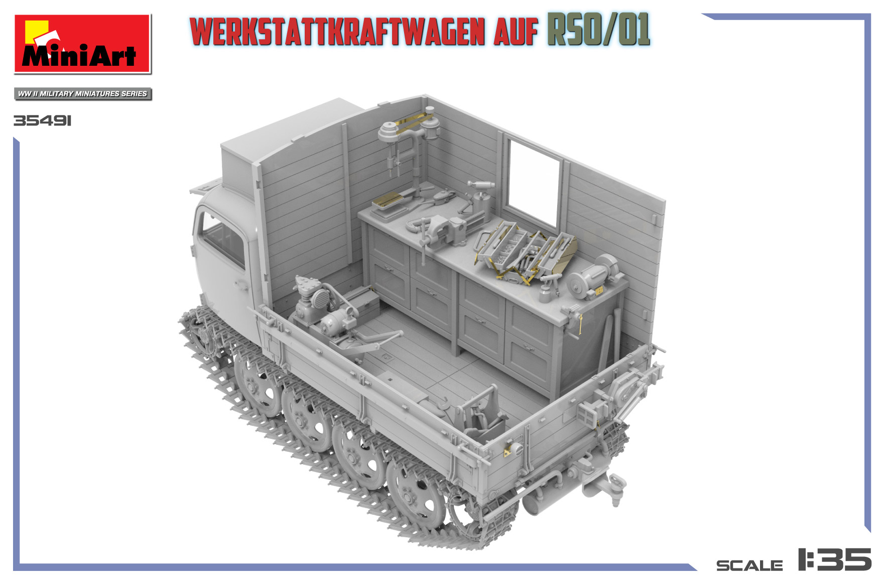 この車両はRSO履帯式トラクターをベースに開発されたドイツ軍の移動式作業車であり、過酷な地形における戦場修理を支援するために設計されました。履帯式シャーシは全地形に対応し、密閉された作業室を搭載した車体は前線近くでの整備作業を可能にしました。