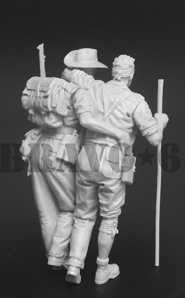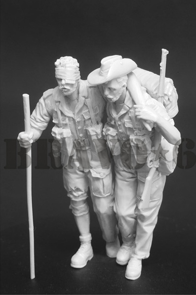 スローチハットを被り、標準の軍服を着崩し、大型のバックパックを背負って行軍する2人の兵士をモデル化しています。一人は片目と片足を負傷し、無帽で右手で杖をついて歩いているポーズ、もう一人はエンフィールド小銃を左肩にかけながら負傷した兵士の腕を担いで解除するポーズで再現しています。