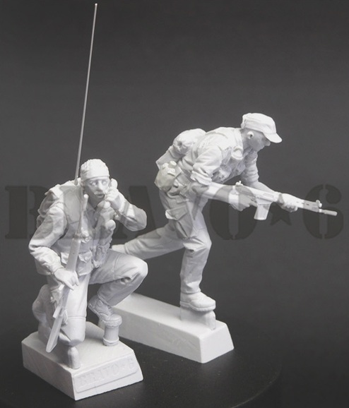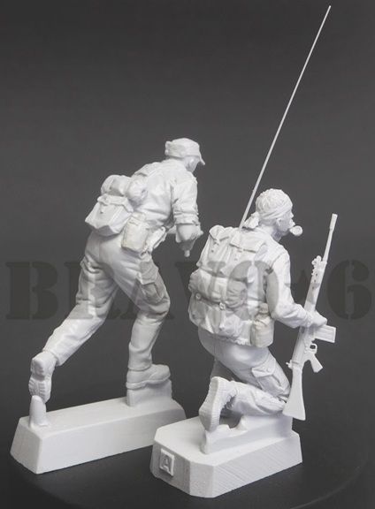 FN FALバトルライフルを構えて前進する兵士と、無線機を背負って膝を付いて通信中の兵士をモデル化しました。軍服や装備品なども精密に再現されています。